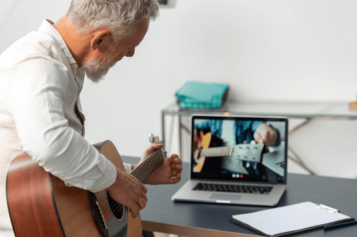 Is my health or age an issue? - The great thing about music is that it's proven by countless studies to IMPROVE your overall health, by boosting your mood, reducing anxiety, blood pressure, and pain as well as improving sleep quality, mental alertness and memory... following the structured courses also boosts your energy and motivation by working toward a goal, being around other like-minded peers who encourage you, and daily exercises that even improve flexibility and relieve arthritis! And since you can go at your own pace, because everything is recorded for you, AND you can get all your questions answered, you will benefit at any age, and you can go as slow or fast as you need to.